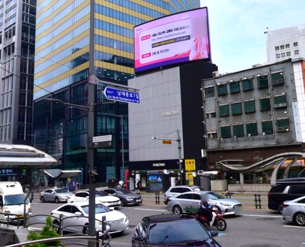 명동 롯데 백화점 본점 바로 맞은편에 위치한 리모와 빌딩 옥상에 위치한 전광판입니다.