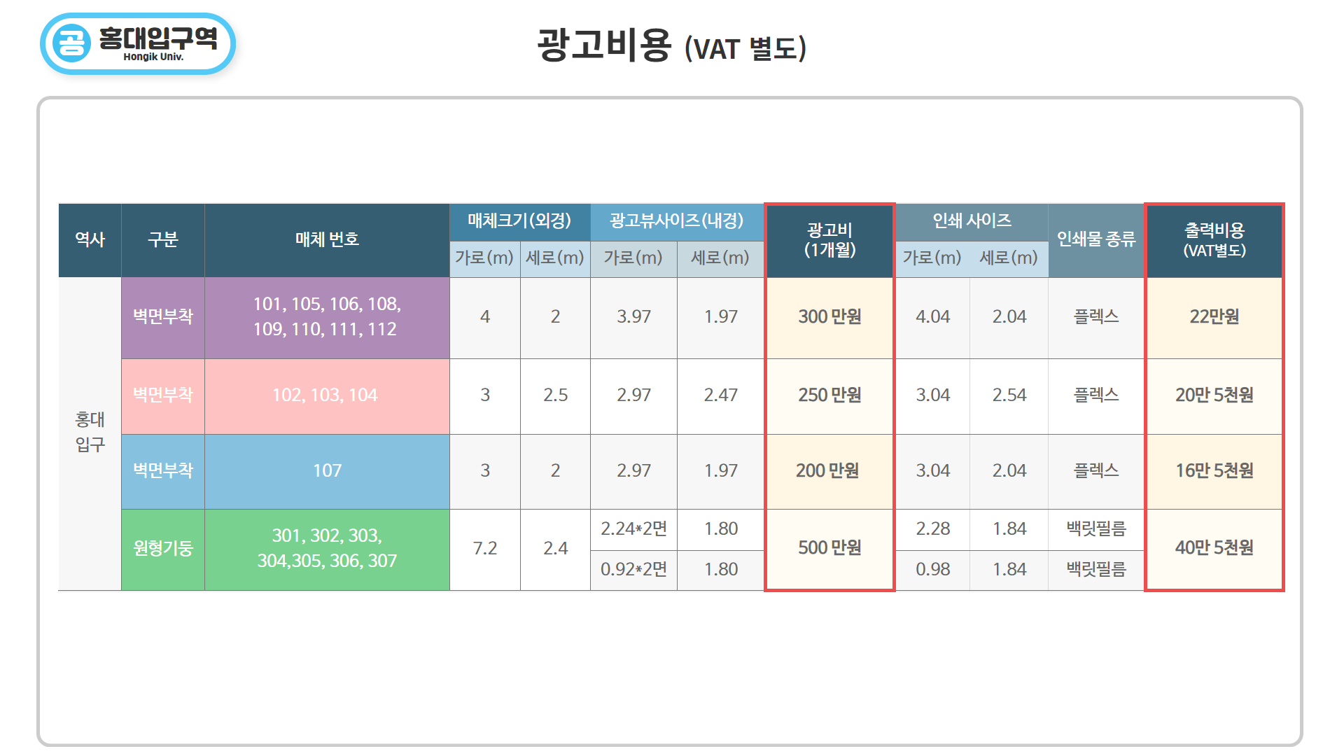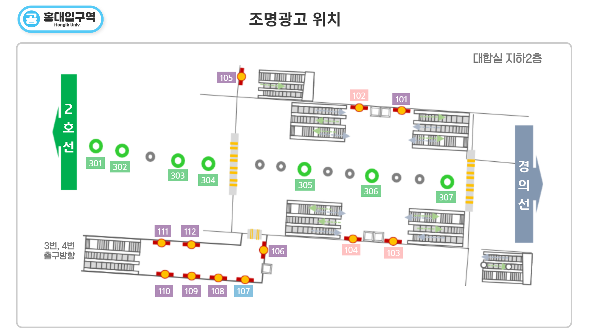 특히, 홍대입구역에서 경의선 숲길로 연결되는 3,4번 출구 방면은 팬클럽 서포트로 인기가 많고 2025년 조명광고 기기들이 추가 설치되었습니다.