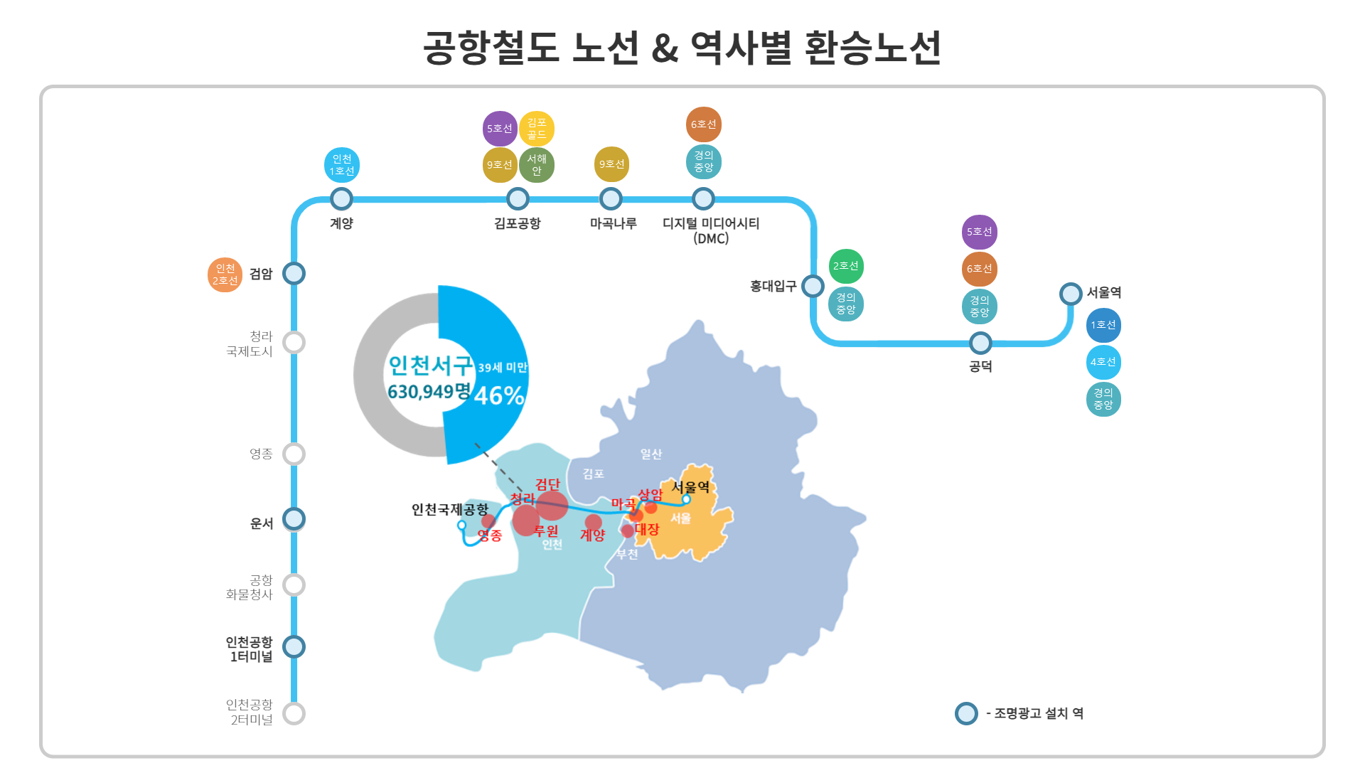조명광고가 설치된 역사는 서울역, 공덕역, 홍대입구역, DMC역, 마곡나루역, 김포공항역, 계양역, 검암역, 운서역, 인천국제공항 제1터미널역으로 총 10개 역사에 설치되어있습니다.