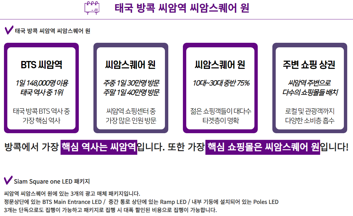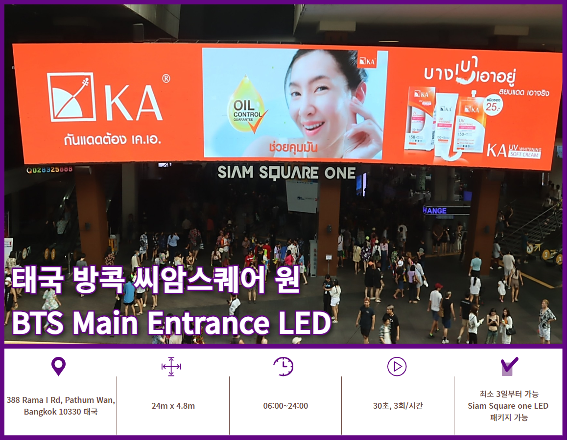 BTS 씨암역에서 바로 연결되는 씨암스퀘어 원 출입구 상단에 BTS 메인 출입구 전광판이 설치되어 있습니다. 그외 Poles LED, Ramp LED 까지 패키지 집행도 가능합니다.