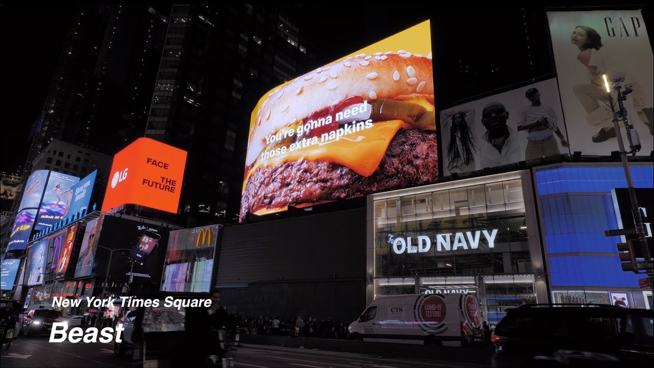 비스트 전광판은 웨스트 45번가와 7번가 교차로에 위치하고 있으며, 맥도날드 건물 위에 있는 대형 직사각형 전광판입니다. 가로 길이 38m의 초 대형 스크린에서 뿜어져 나오는 고화질의 영상은 대중들의 이목을 집중시킵니다. 교차로에서 수많은 사람들이 보행하며 이 전광판을 볼 수 있습니다.