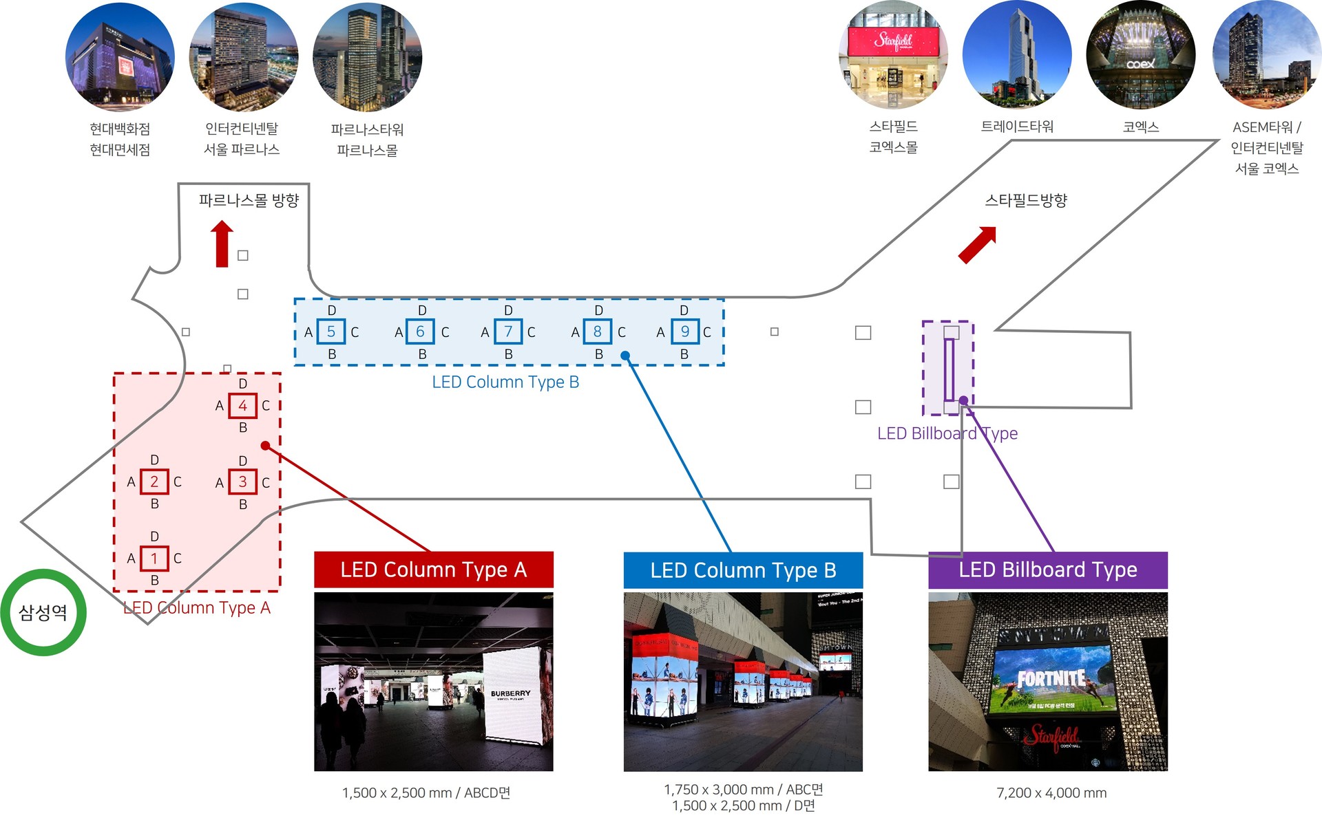 9개의 사각 기둥과 대형 LED 보드로 구성되어 있어요. 삼성역에서 코엑스로 이동하는 동선에 맞춰서 디지털보드가 배치되어 있기 때문에 메시지 전달력이 뛰어납니다. 9개의 사각 기둥의 각 면마다 영상이 송출되어서 멋진 효과를 연출할 수 있습니다.