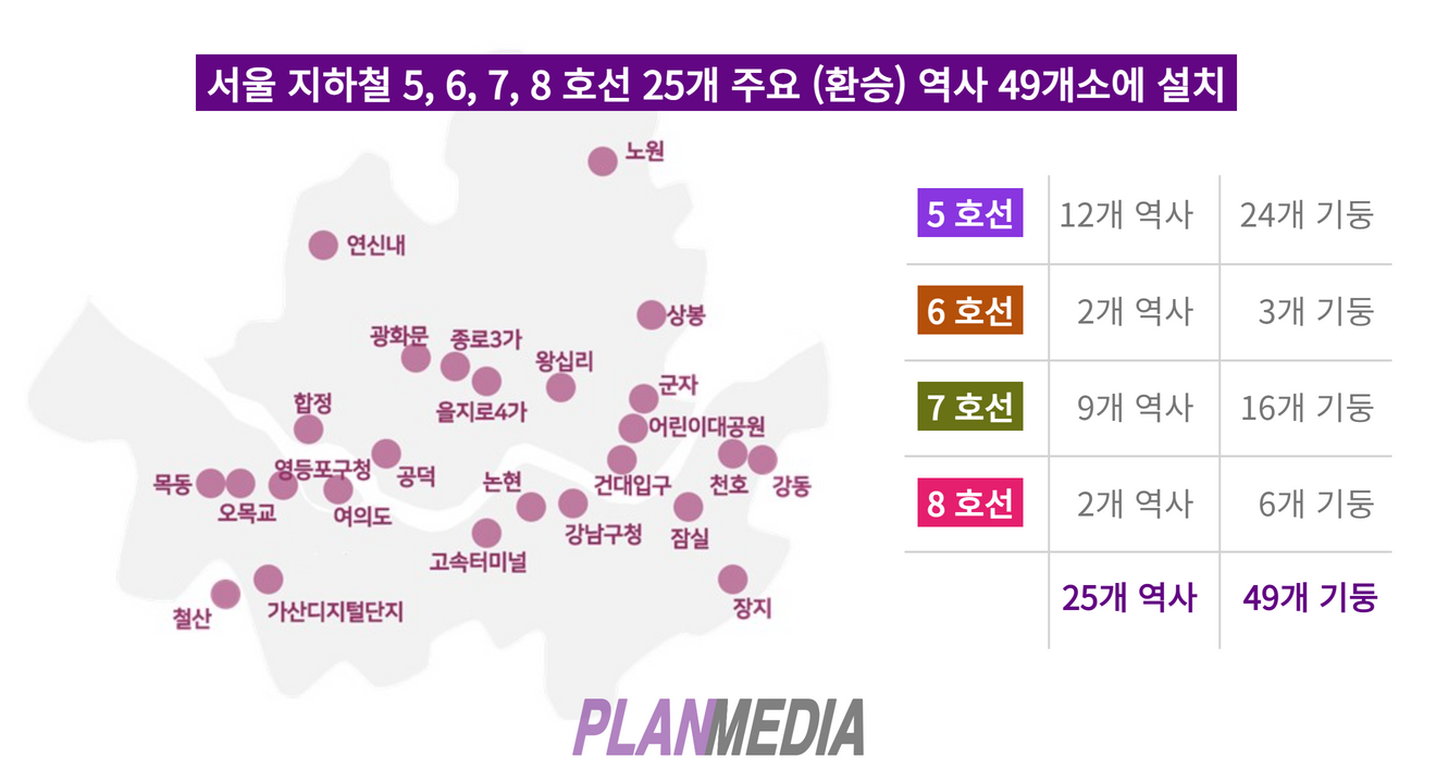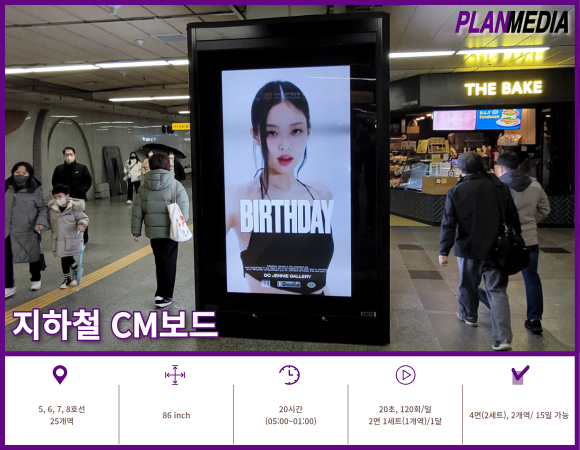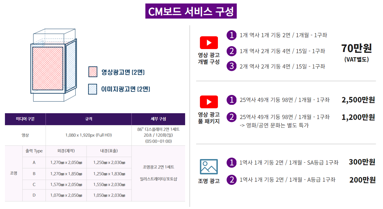 지하철 CM보드는 서울 지하철 5호선, 6호선, 7호선, 8호선의 25개 주요 환승 역사에 설치되어 있는 4각 기둥형 보드 광고입니다.