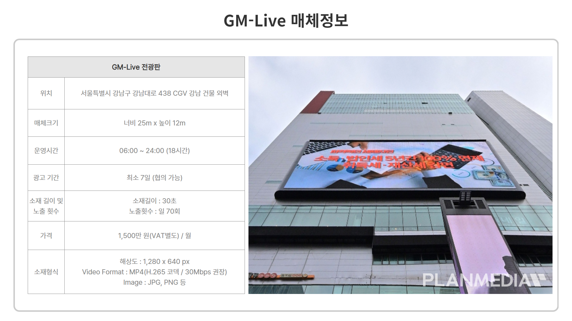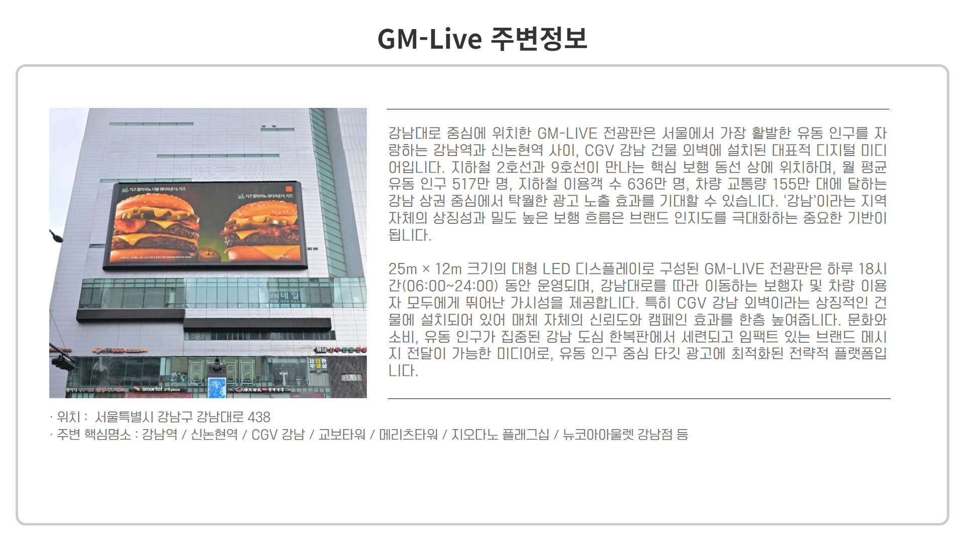 25m × 12m 크기의 대형 LED 디스플레이로 구성된 GM-LIVE 전광판은 하루 18시간(06:00~24:00) 동안 운영되며, 강남대로를 따라 이동하는 보행자 및 차량 이용자 모두에게 뛰어난 가시성을 제공합니다. 특히 CGV 강남 외벽이라는 상징적인 건물에 설치되어 있어 매체 자체의 신뢰도와 캠페인 효과를 한층 높여줍니다. 문화와 소비, 유동 인구가 집중된 강남 도심 한복판에서 세련되고 임팩트 있는 브랜드 메시지 전달이 가능한 미디어로, 유동 인구 중심 타깃 광고에 최적화된 전략적 플랫폼입니다.