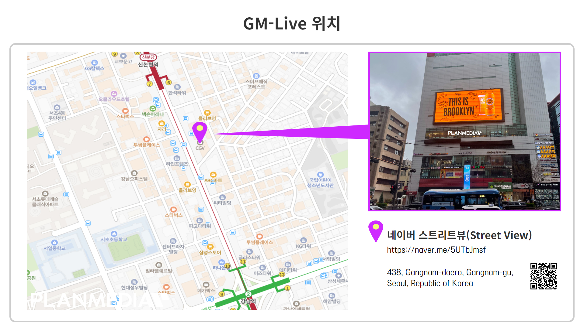 강남대로 중심에 위치한 GM-LIVE 전광판은 서울에서 가장 활발한 유동 인구를 자랑하는 강남역과 신논현역 사이, CGV 강남 건물 외벽에 설치된 대표적 디지털 미디어입니다. 지하철 2호선과 9호선이 만나는 핵심 보행 동선 상에 위치하며, 월 평균 유동 인구 517만 명, 지하철 이용객 수 636만 명, 차량 교통량 155만 대에 달하는 강남 상권 중심에서 탁월한 광고 노출 효과를 기대할 수 있습니다. ‘강남’이라는 지역 자체의 상징성과 밀도 높은 보행 흐름은 브랜드 인지도를 극대화하는 중요한 기반이 됩니다.