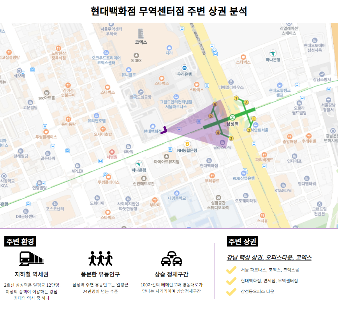 현대백화점 무역센터점은 테헤란로와 영동대로 사이 그랜드인터컨티넨탈 바로 옆으로 삼성역 5번 출구 쪽에 있는 빌딩입니다. 현대백화점, 면세점, 무역센터점과 연결되어 대형 상권 형성 및 관광객 선호 지역이며 아셈타워, 무역센터, 글래스타워 등 오피스빌딩 밀집하여 직장인들 출퇴근 경유지역으로 월 승하차 인구가 300만명이 넘는 수많은 유동인구를 확보하고 있습니다.