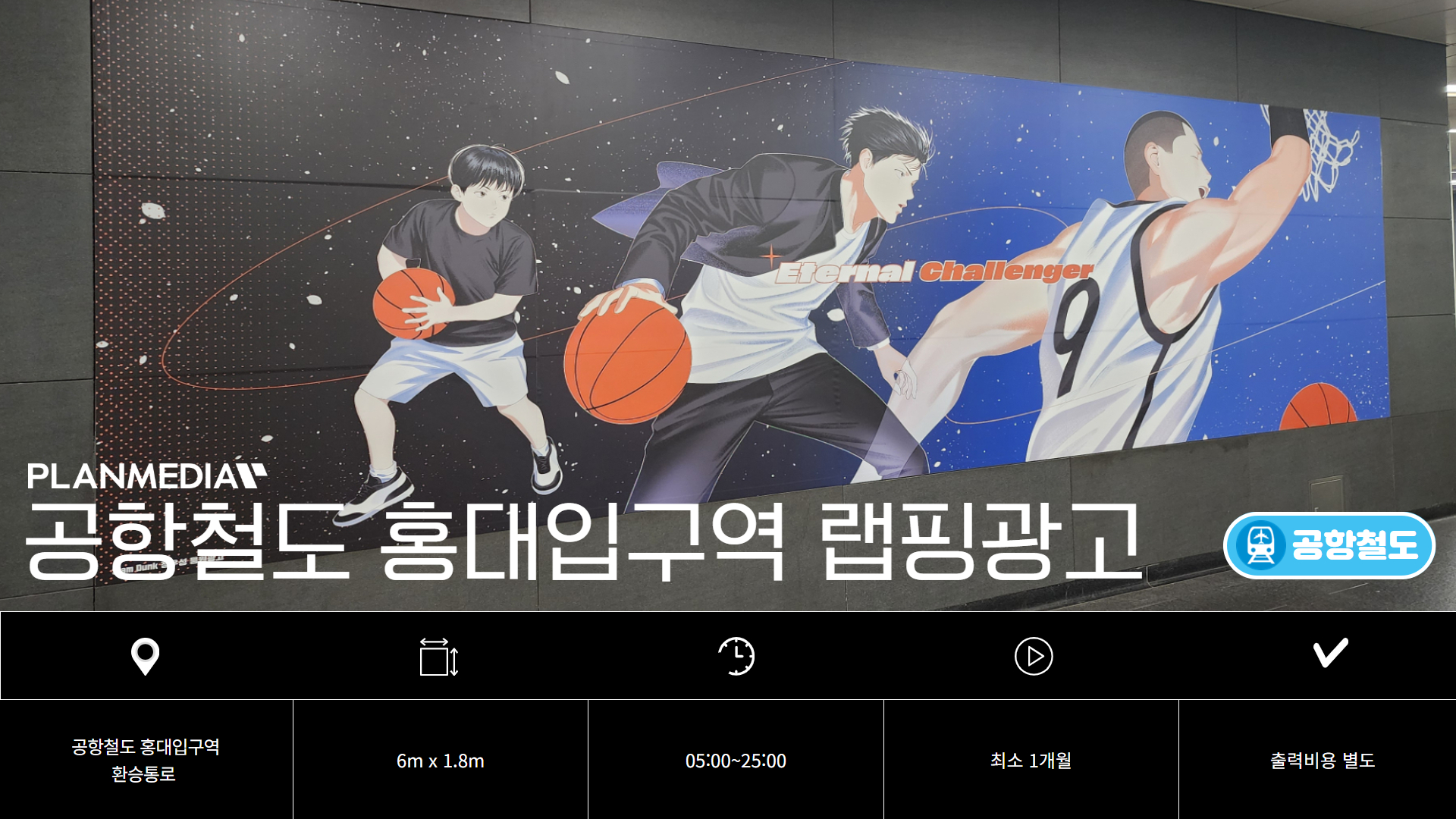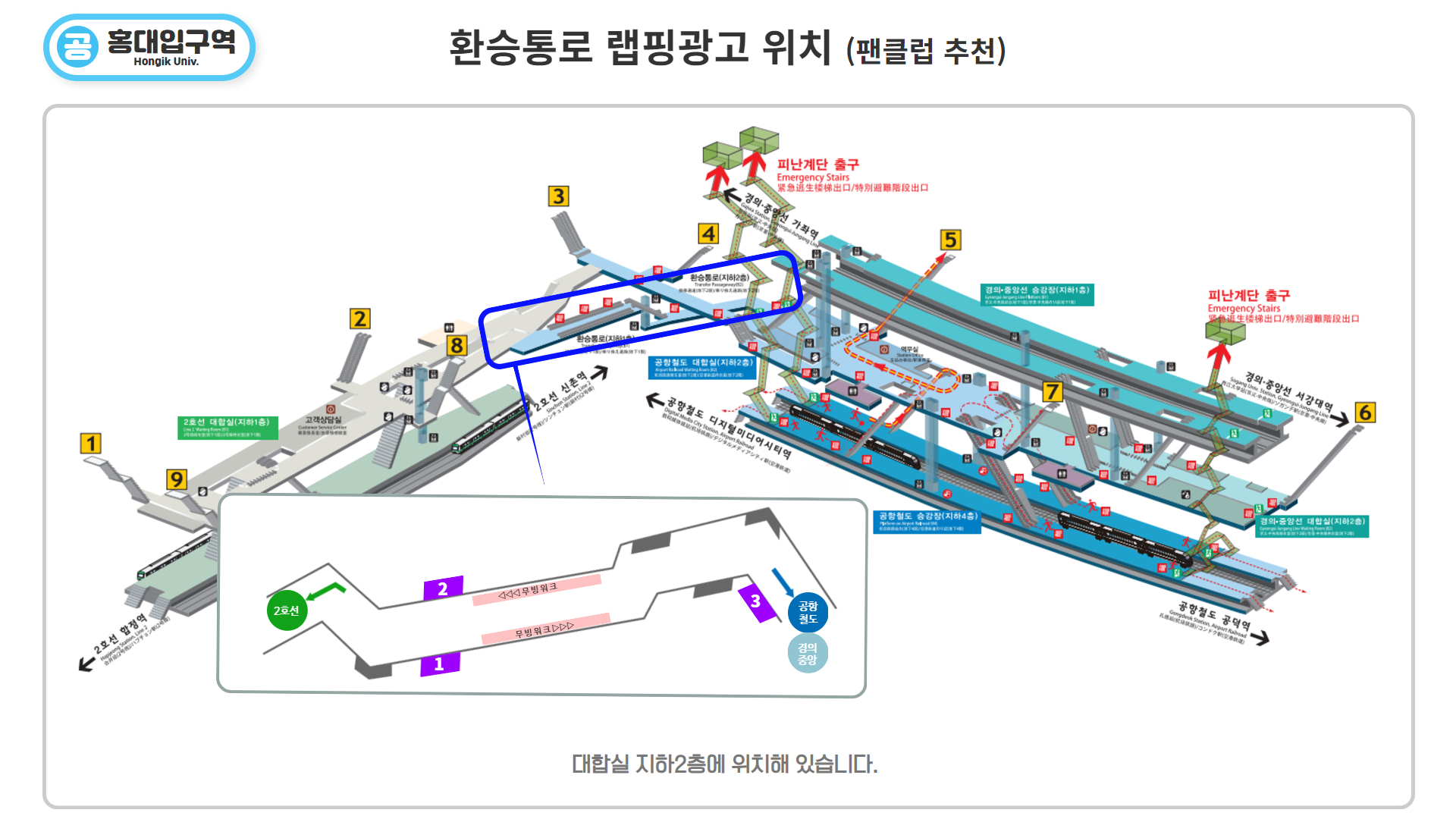 환승통로 좌우 벽면에 총 3개의 래핑 광고가 있으며, 약 6m 길이로 주목도가 높아 팬클럽 광고로 인기가 많습니다. 래핑 광고 주변으로는 공항철도 디지털사이니지 4기 세트가 있어 같이 광고를 집행할 수 있습니다.