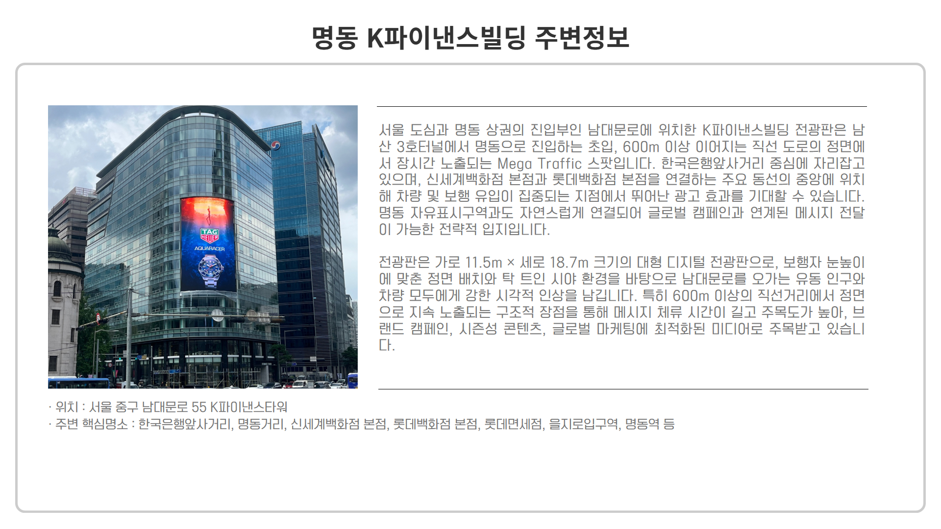 전광판은 가로 11.5m × 세로 18.7m 크기의 대형 디지털 전광판으로, 보행자 눈높이에 맞춘 정면 배치와 탁 트인 시야 환경을 바탕으로 남대문로를 오가는 유동 인구와 차량 모두에게 강한 시각적 인상을 남깁니다. 특히 600m 이상의 직선거리에서 정면으로 지속 노출되는 구조적 장점을 통해 메시지 체류 시간이 길고 주목도가 높아, 브랜드 캠페인, 시즌성 콘텐츠, 글로벌 마케팅에 최적화된 미디어로 주목받고 있습니다.