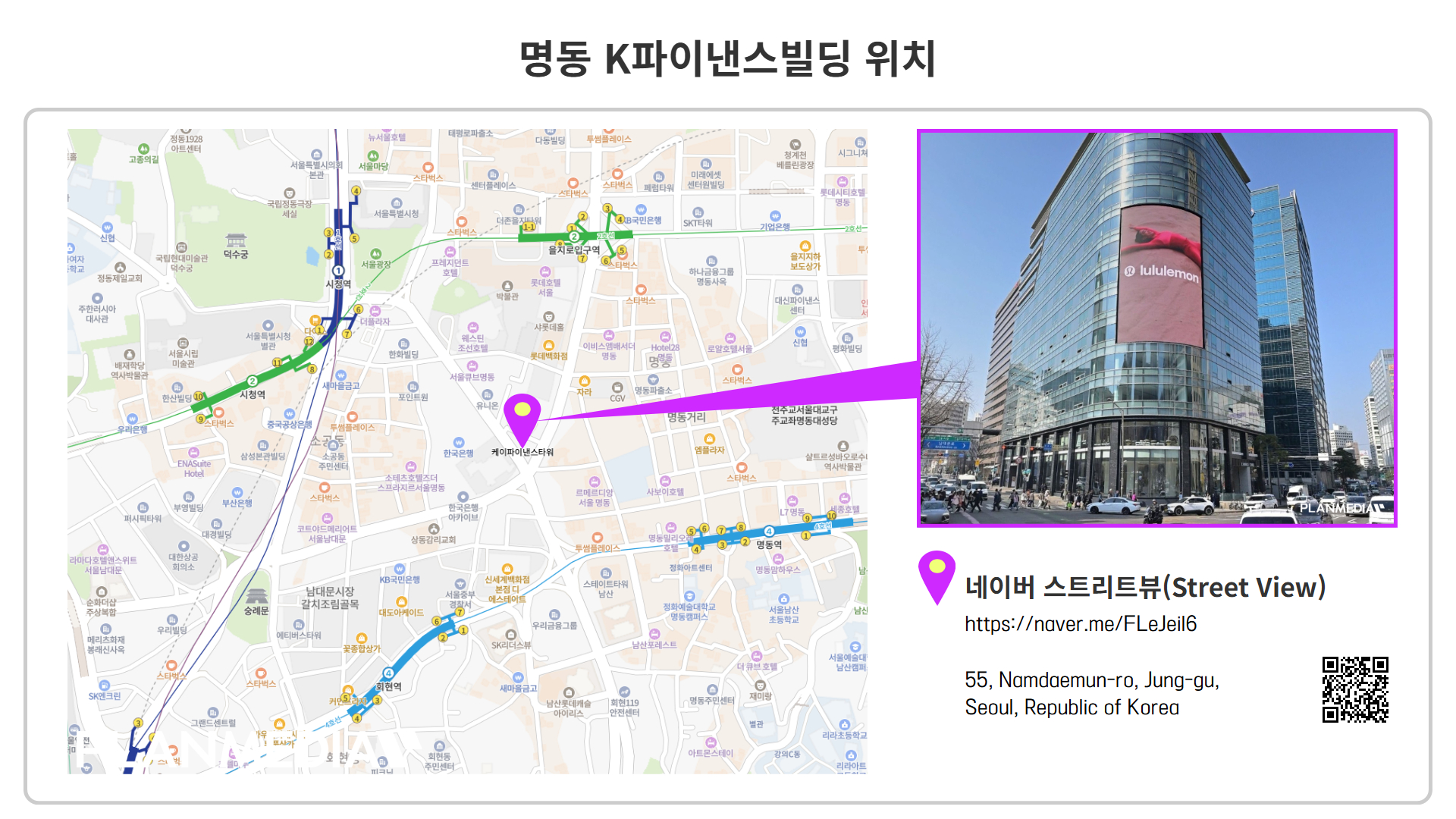 서울 도심과 명동 상권의 진입부인 남대문로에 위치한 K파이낸스빌딩 전광판은 남산 3호터널에서 명동으로 진입하는 초입, 600m 이상 이어지는 직선 도로의 정면에서 장시간 노출되는 Mega Traffic 스팟입니다. 한국은행앞사거리 중심에 자리잡고 있으며, 신세계백화점 본점과 롯데백화점 본점을 연결하는 주요 동선의 중앙에 위치해 차량 및 보행 유입이 집중되는 지점에서 뛰어난 광고 효과를 기대할 수 있습니다. 명동 자유표시구역과도 자연스럽게 연결되어 글로벌 캠페인과 연계된 메시지 전달이 가능한 전략적 입지입니다.
