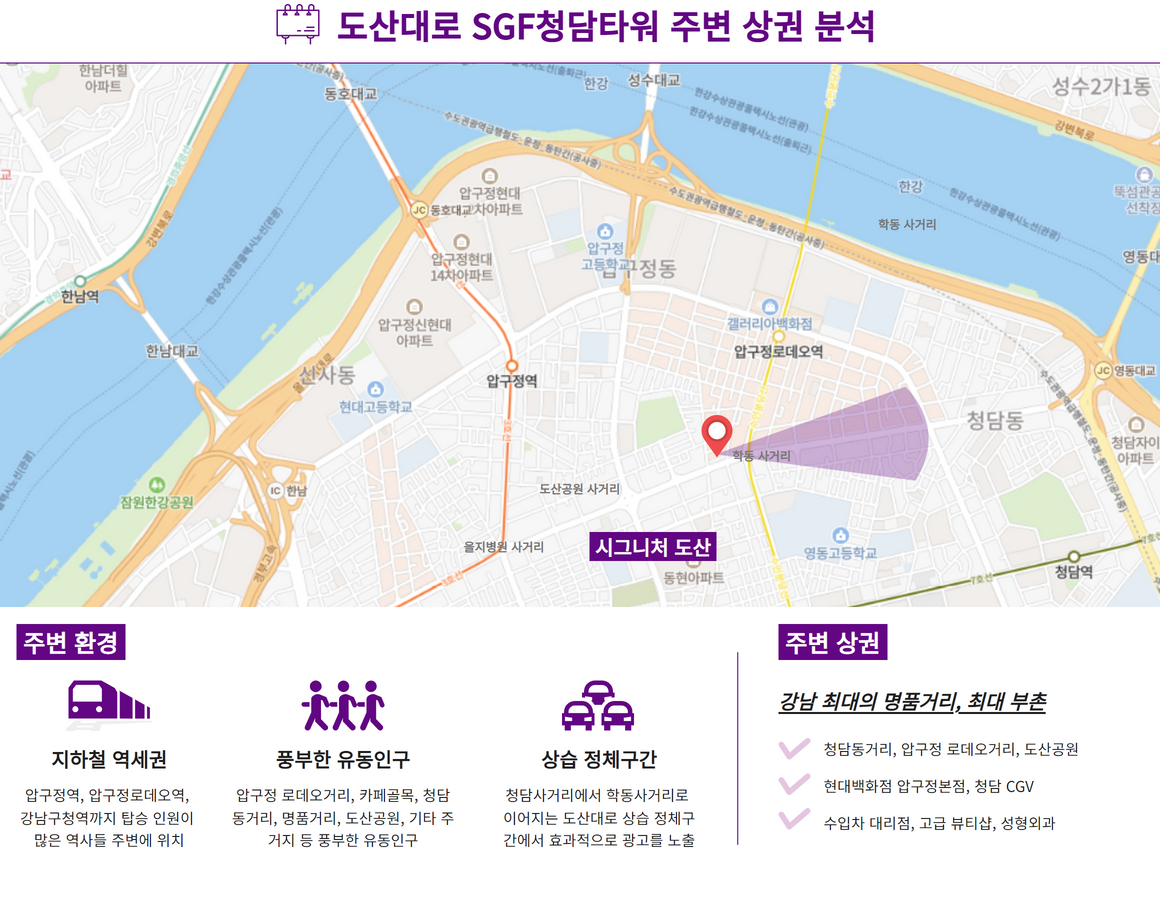 도산대로 SGF청담타워는 도산대로 대로변에 위치하고 있으며 학동사거리 바로 앞에 있는 도산대로 랜드마크 건물 중 하나입니다. 건물 주변이 바로 압구정 로데오거리, 청담동명품거리이며 청담CGV바로 옆에 있어 풍부한 유동인구를 확보하고 있습니다.