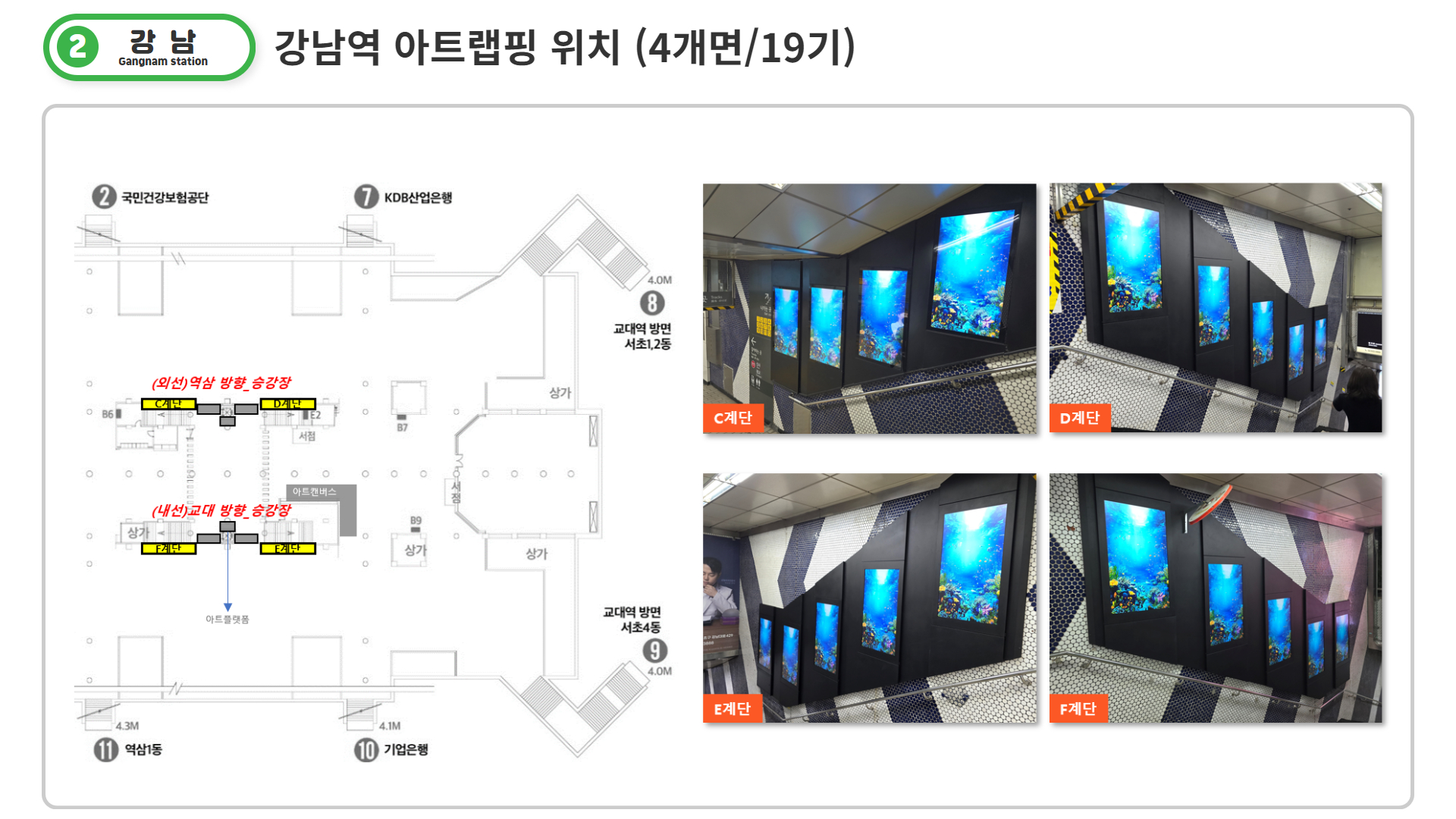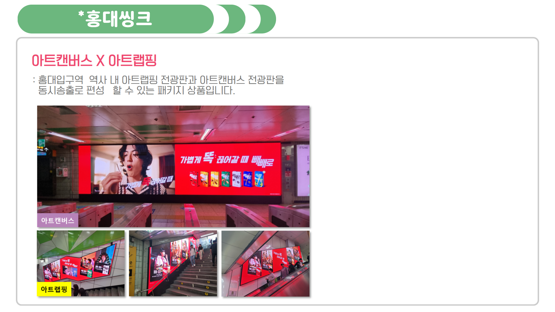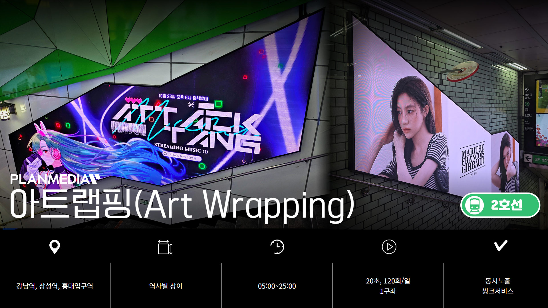 각 역사에 설치되어있는 모든 아트랩핑 면에서 역사별로 동시송출되는 매체로, 홍대입구에 7면, 삼성역에 4면, 강남역에 4면(19기)이 역사별로 동시노출 됩니다.