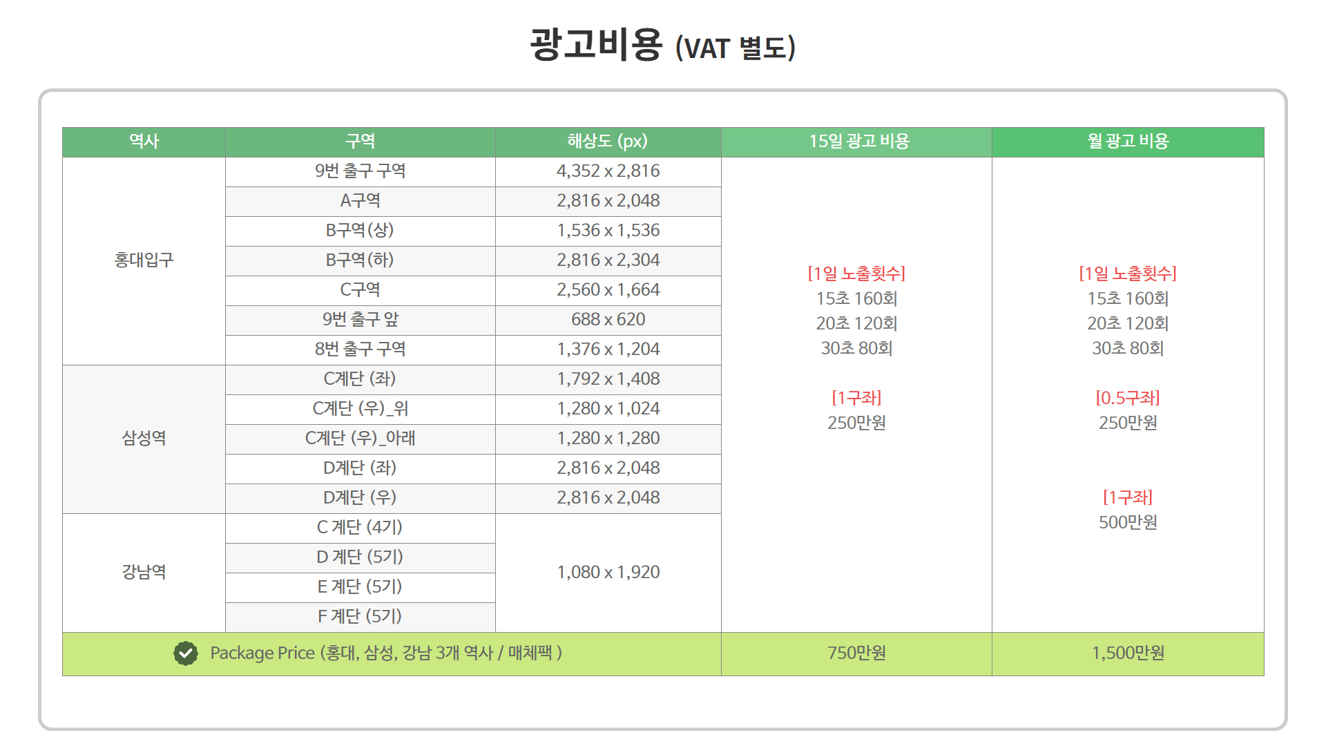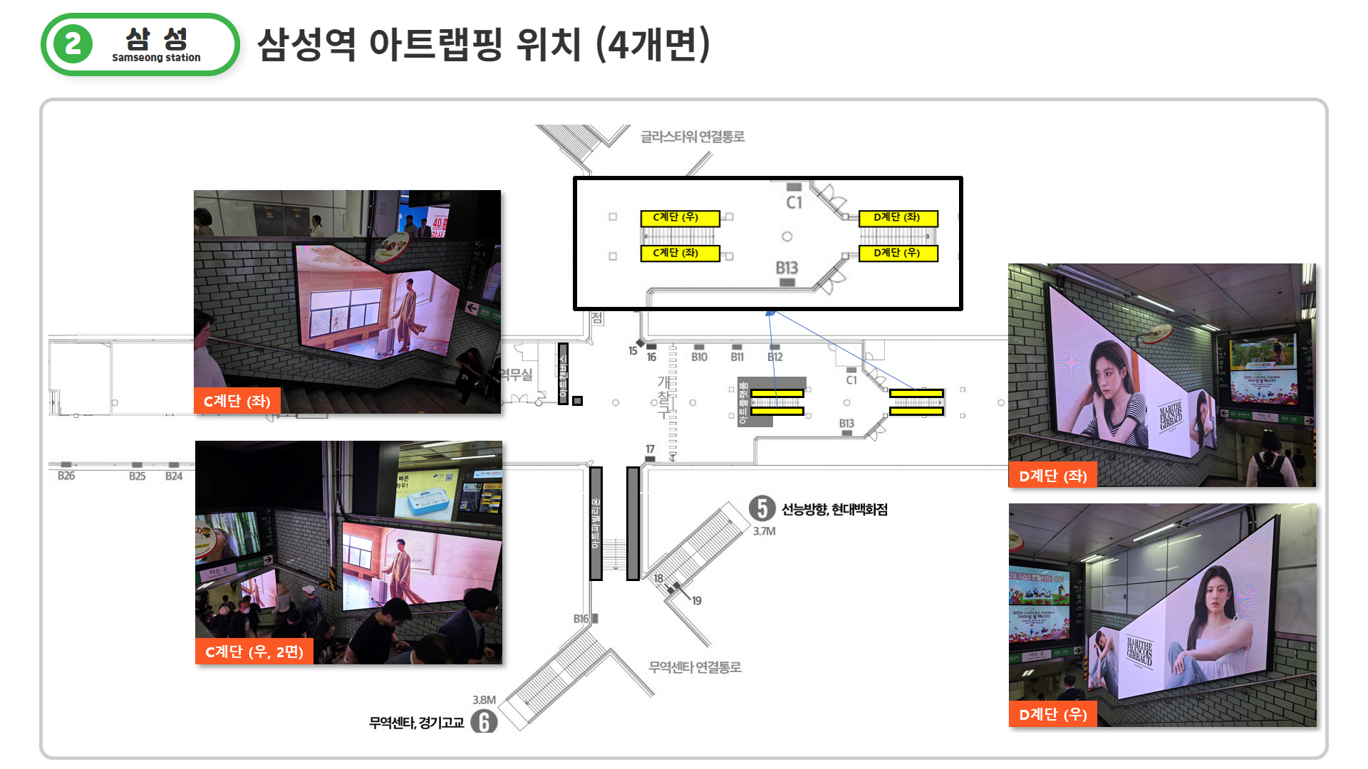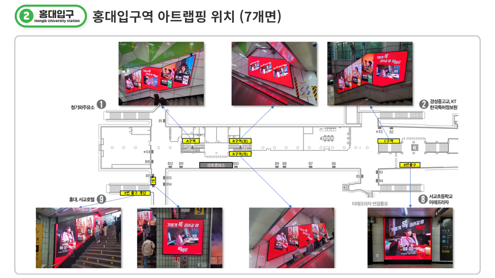 각 역사에 설치되어있는 모든 아트랩핑 면에서 역사별로 동시송출되는 매체로, 홍대입구에 7면, 삼성역에 4면, 강남역에 4면(19기)이 역사별로 동시노출 됩니다.