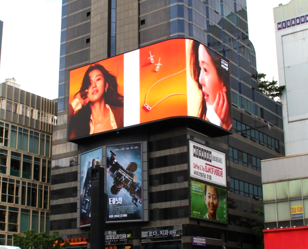 라운드 형태의 전광판은 정면, 우측 모두 소재 노출이 가능하여 다양한 형태의 기획 연출이 가능합니다.