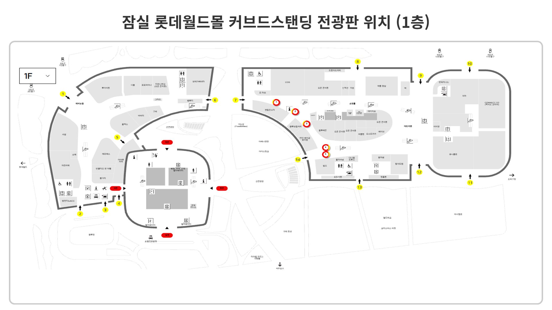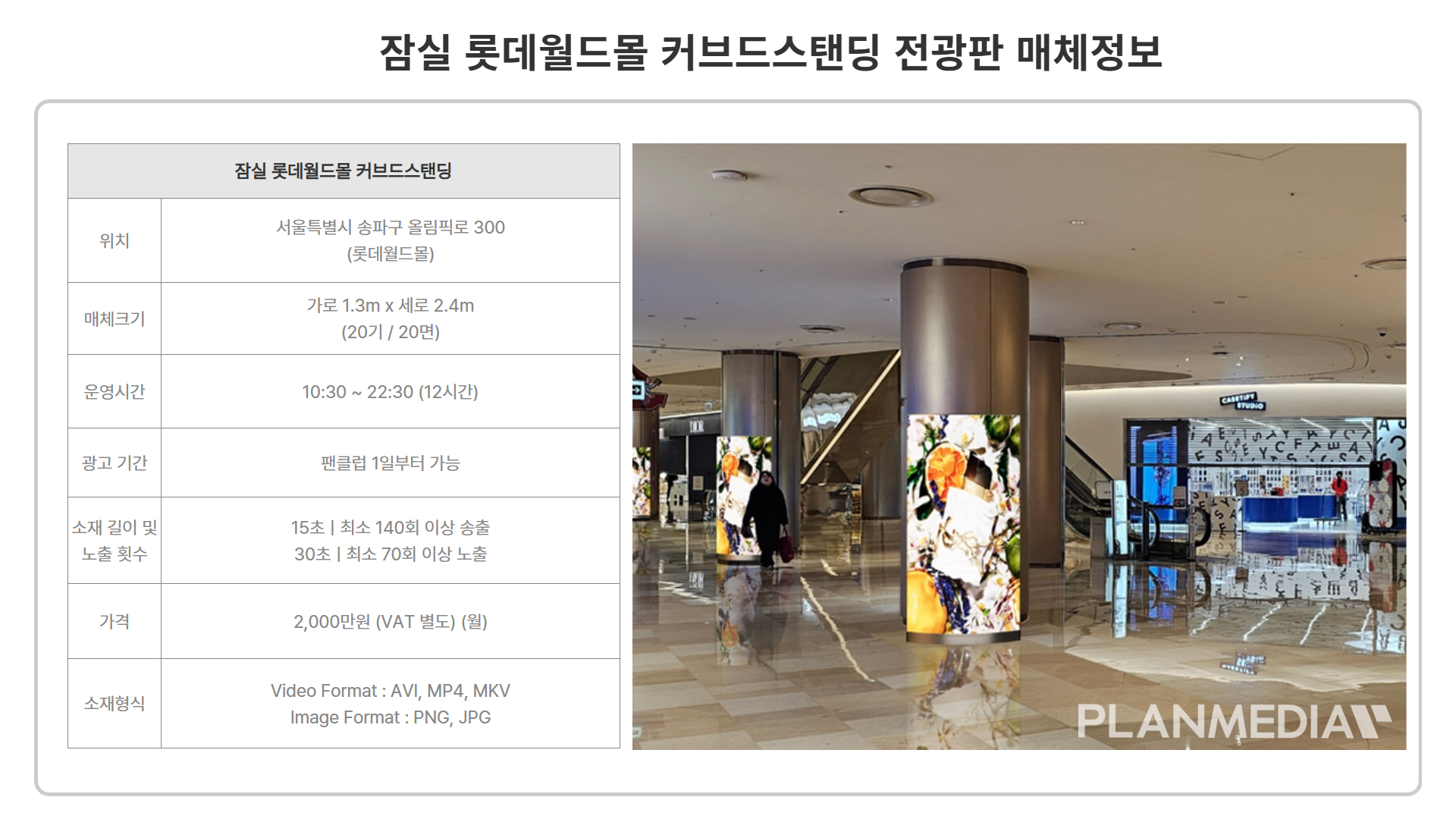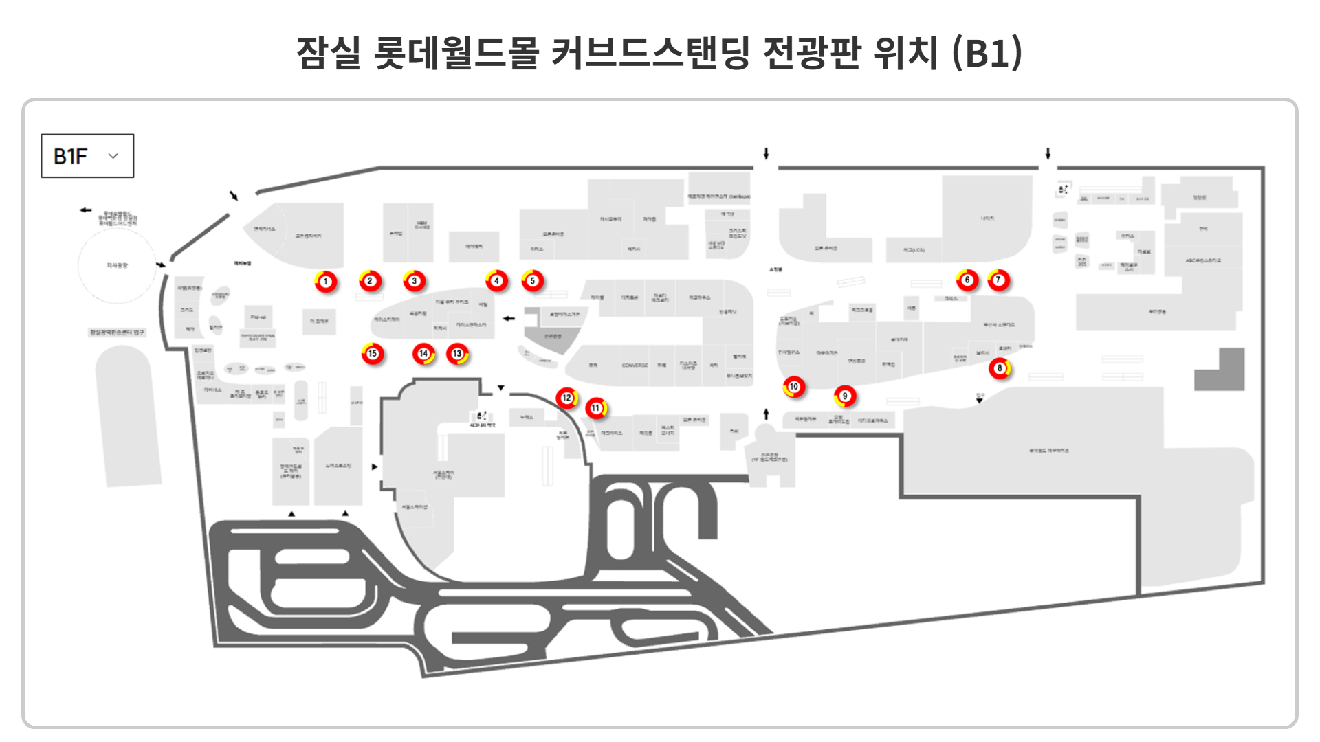 롯데월드몰 커브드 스탠딩 미디어는 쇼핑몰 내 주요 이동 동선을 따라 B1층부터 1층까지 설치된 디지털 사이니지 매체입니다. B1층에는 지하철과 연결된 롯데백화점 에비뉴엘 잠실 방면에서 아쿠아리움 방향까지 총 15대가, 1층에는 아레나 광장으로 나가는 게이트 인근에 5대가 배치되어 총 20대로 운영되고 있습니다.