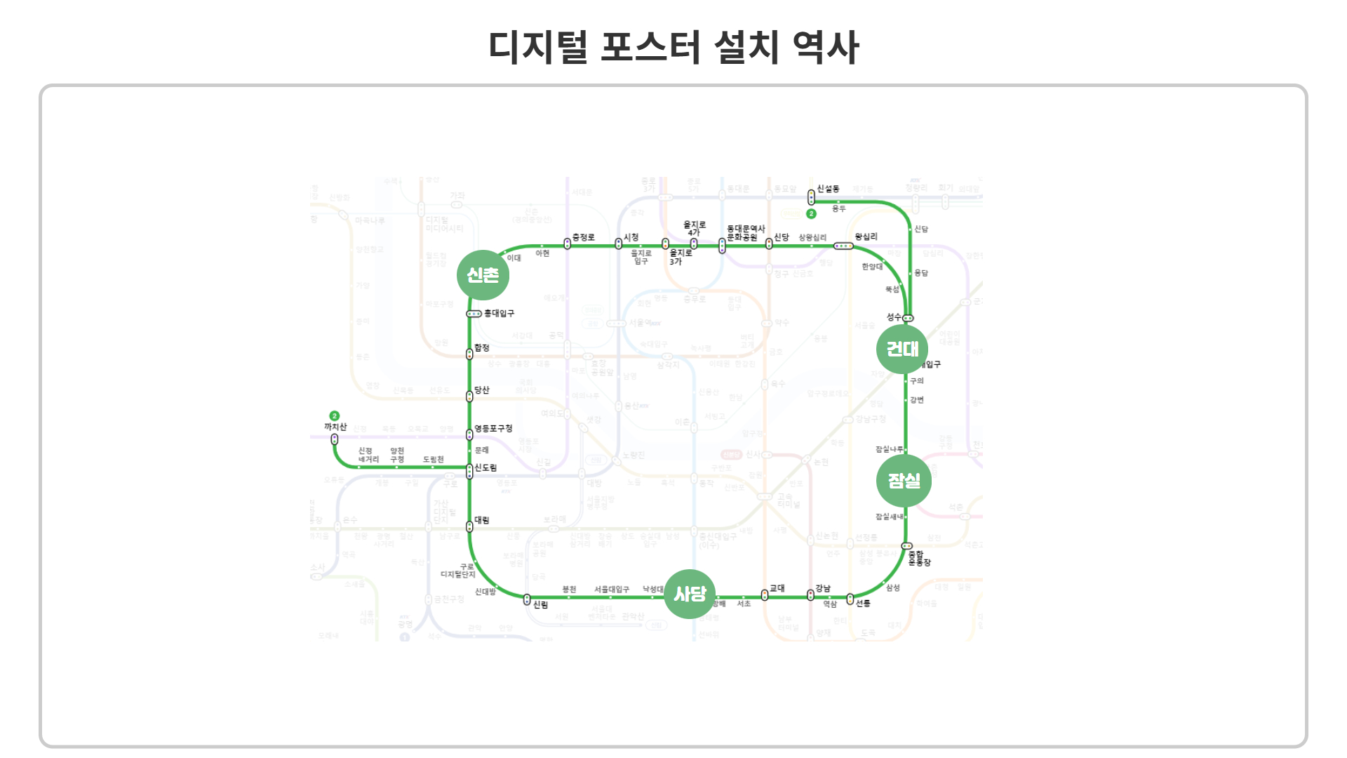 지하철 디포스테이션은 서울 지하철 1호선~8호선에 있는 주요 32개 역사에 설치되어 있는 디지털 포스터형태의 보드 광고입니다.