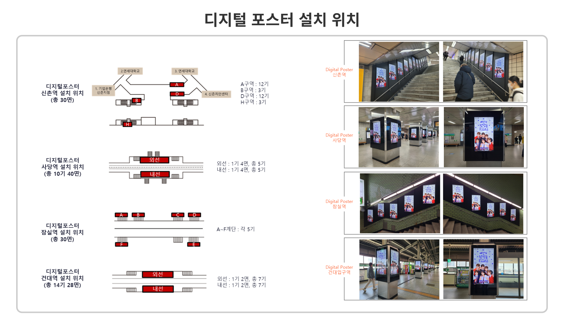 개별 역마다 적개는 6개부터 많게는 40개까지의 수량이 배치되어 있으며, 15초 영상이 하루150회 이상 노출됩니다.