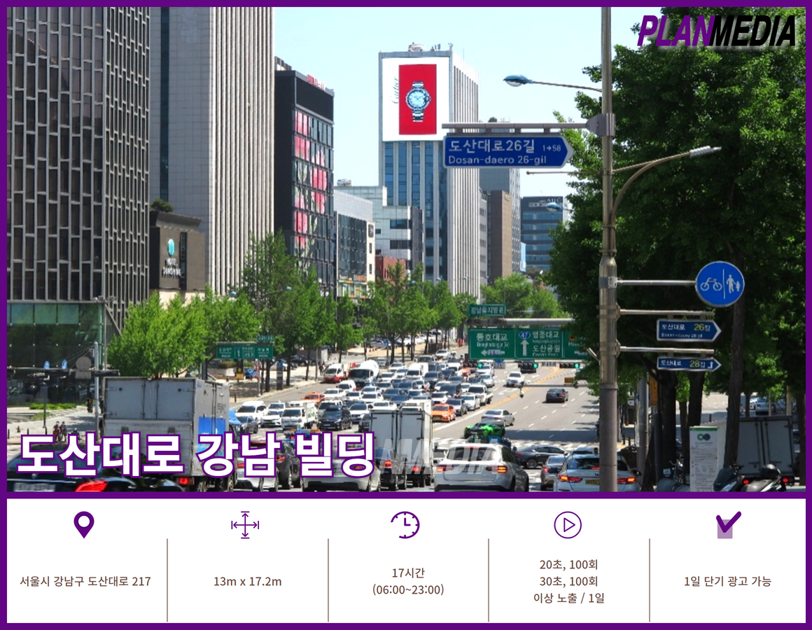 도산대로 을지병원 사거리에 위치한 강남 빌딩은 강남의 대표적인 부촌 거리에 속하는 도산대로변에 위치한 빅사이즈 전광판입니다.
