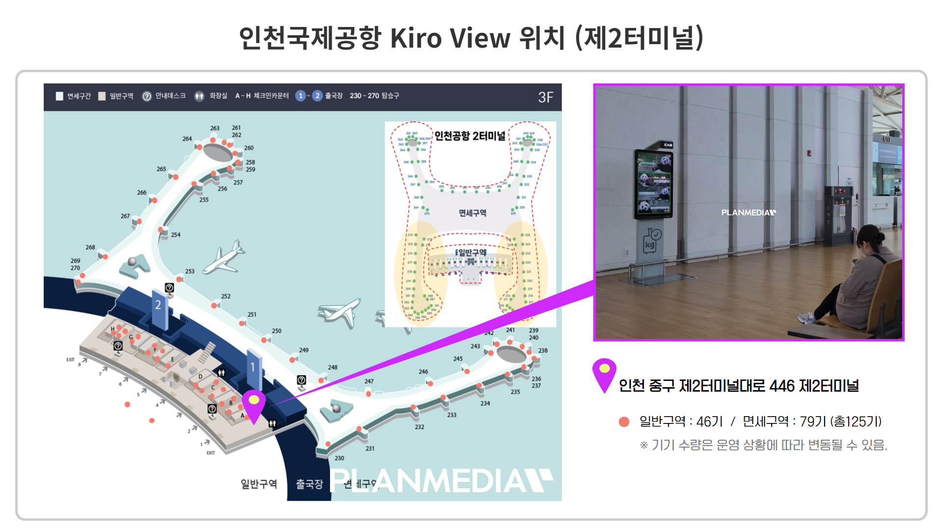 인천국제공항 전역에 설치된 **KiroView(키로뷰)**는 세계 각국의 여행객들이 모이는 공항의 주요 동선을 따라 자연스럽게 노출되는 수화물 무게 측정 키오스크 기반의 디지털 미디어입니다. 제1여객터미널 121기, 제2여객터미널 125기, 총 246기의 키오스크가 일반 구역과 면세 구역에 고르게 설치되어 있으며, 공항철도·버스·택시가 연결되는 교통센터부터 체크인, 면세 쇼핑, 탑승 대기 구역까지 이어지는 경로를 따라 탁월한 노출 효과를 자랑합니다.