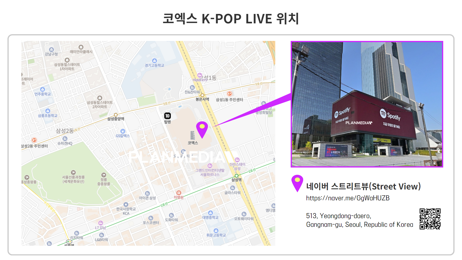 코엑스 K-POP LIVE는 서울 삼성역 6번 출구 방면, 코엑스 아티움 외벽에 설치된 초대형 전광판으로, 전 세계 한류 팬들과 관광객들에게 널리 알려진 명소입니다. 인근에는 스타필드 코엑스몰, 현대백화점 무역센터점 등이 위치해 있어 유동 인구가 매우 많은 핵심 상권이며, 월 평균 약 500만 명 이상이 이 일대를 오가는 만큼 탁월한 노출 효과를 자랑합니다.