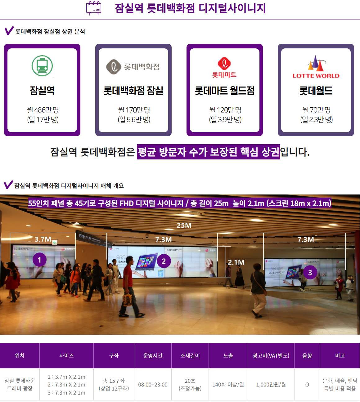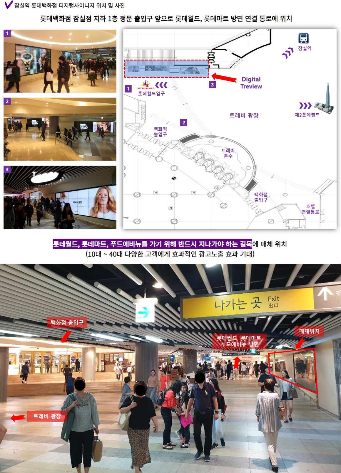 2호선 잠실역, 롯데백화점, 롯데월드, 롯데마트로 이어지는 중심 광장에 있어 수많은 유동인구가 보장된 위치입니다.