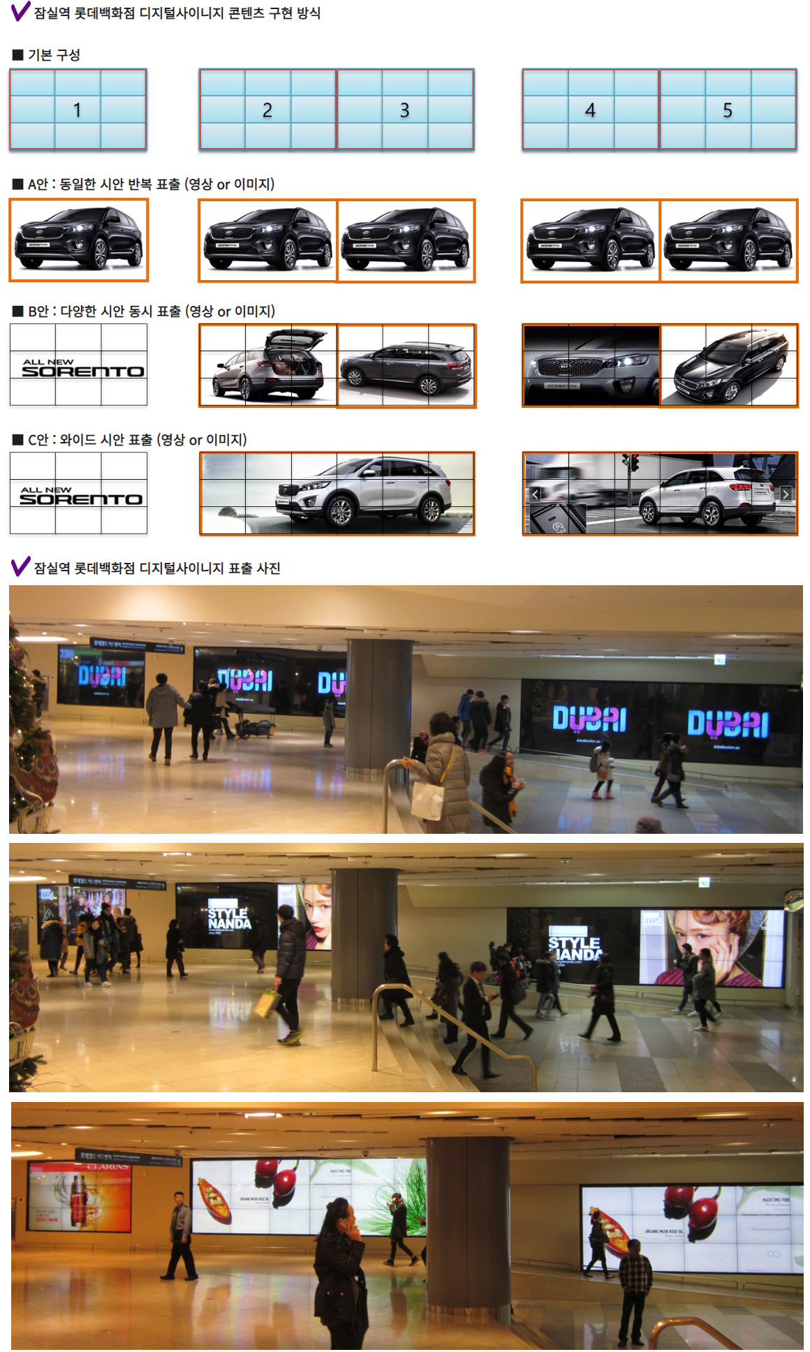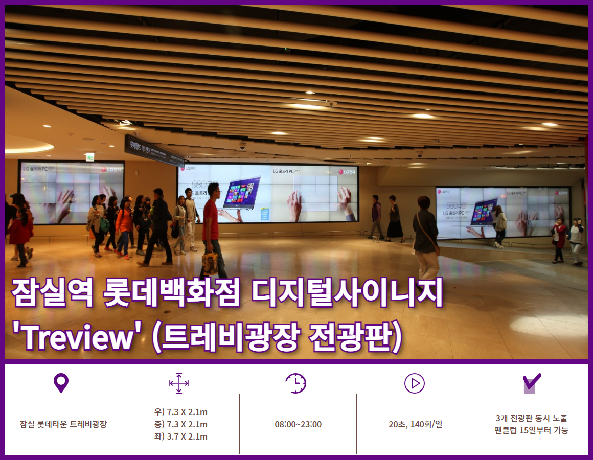 잠실역과 연결되는 롯데백화점 잠실점 디지털사이니지는 롯데백화점 지하 1층 정문 출입구 앞에 설치되어 있으며 롯데월드, 롯데마트 방면으로 이동하는 핵심 통로에 위치하고 있습니다.