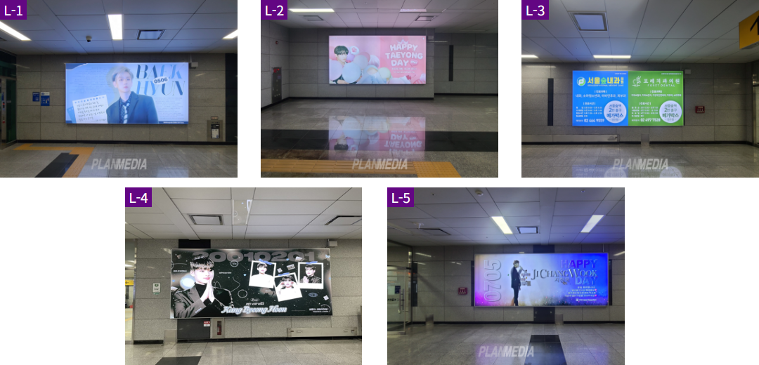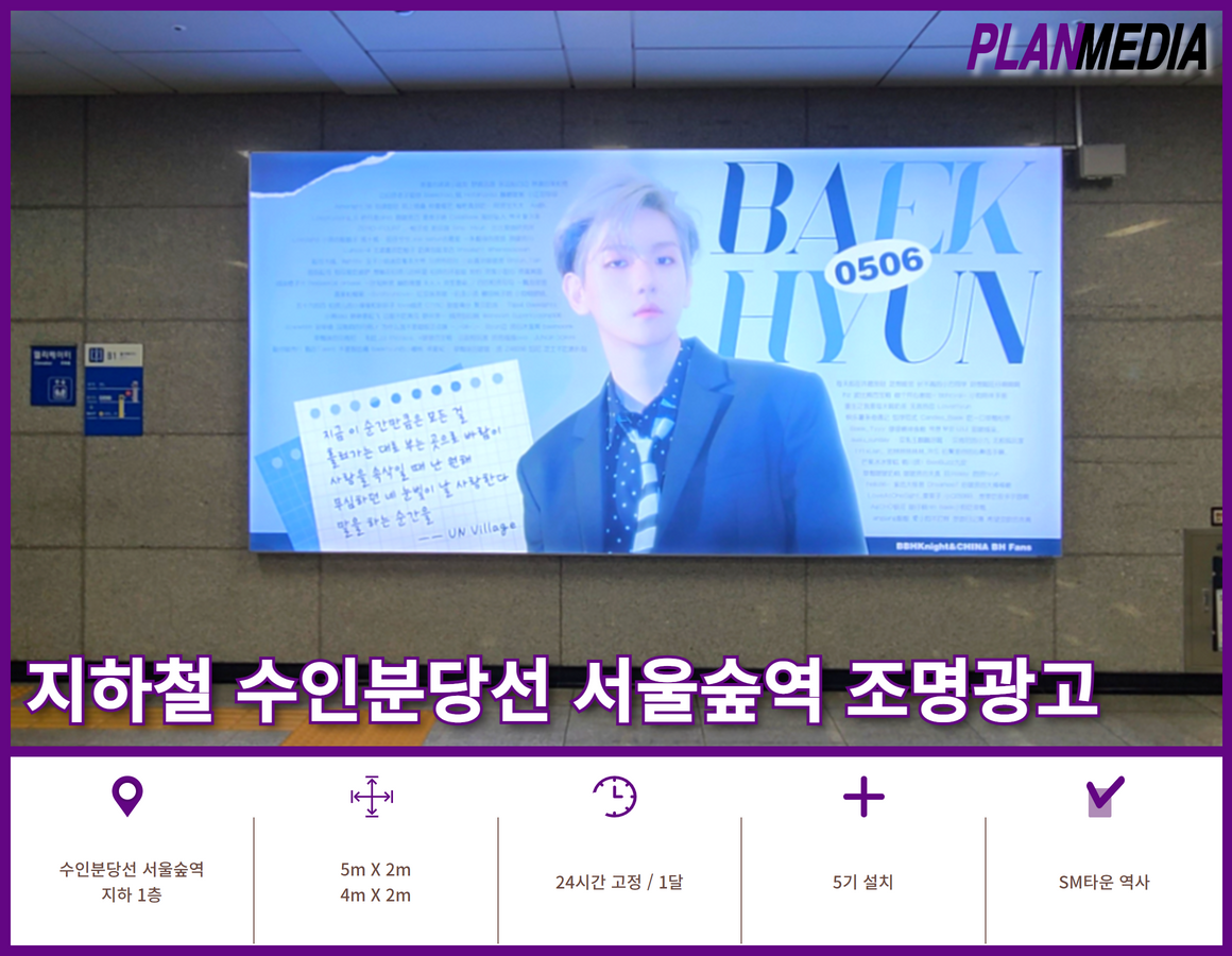 서울숲역은 특히 SM타운과 연결된 지리적 이점을 가지고 있기 때문에 팬덤 광고가 주를 이루는 곳입니다. 광고 구좌 확보를 위해서는 미리 부킹을 잡아야 희망일정에 광고가 가능합니다.