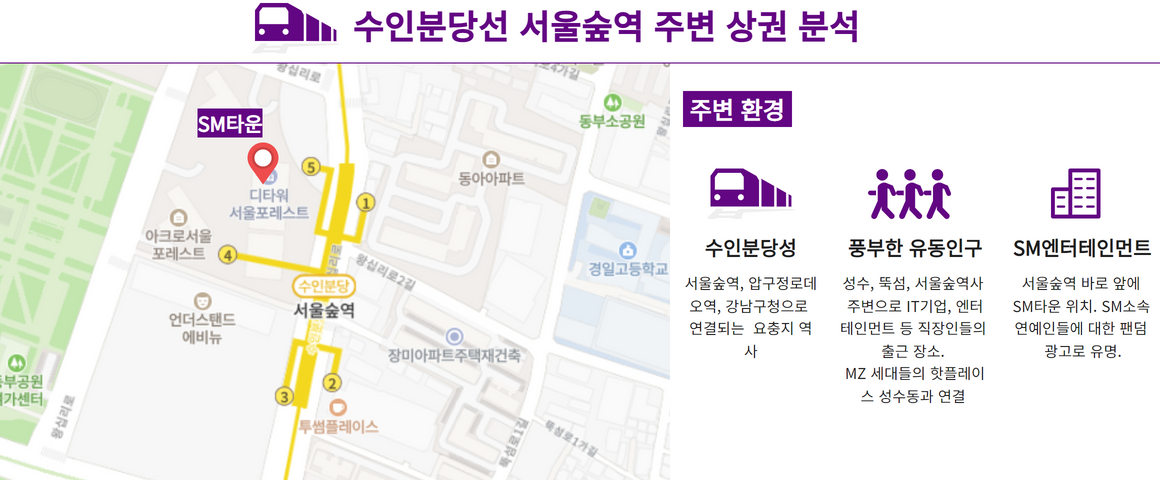 지하철 수인분당선 노선 중 서울숲역은 총 5개의 와이드칼라 조명광고가 설치되어 있습니다.