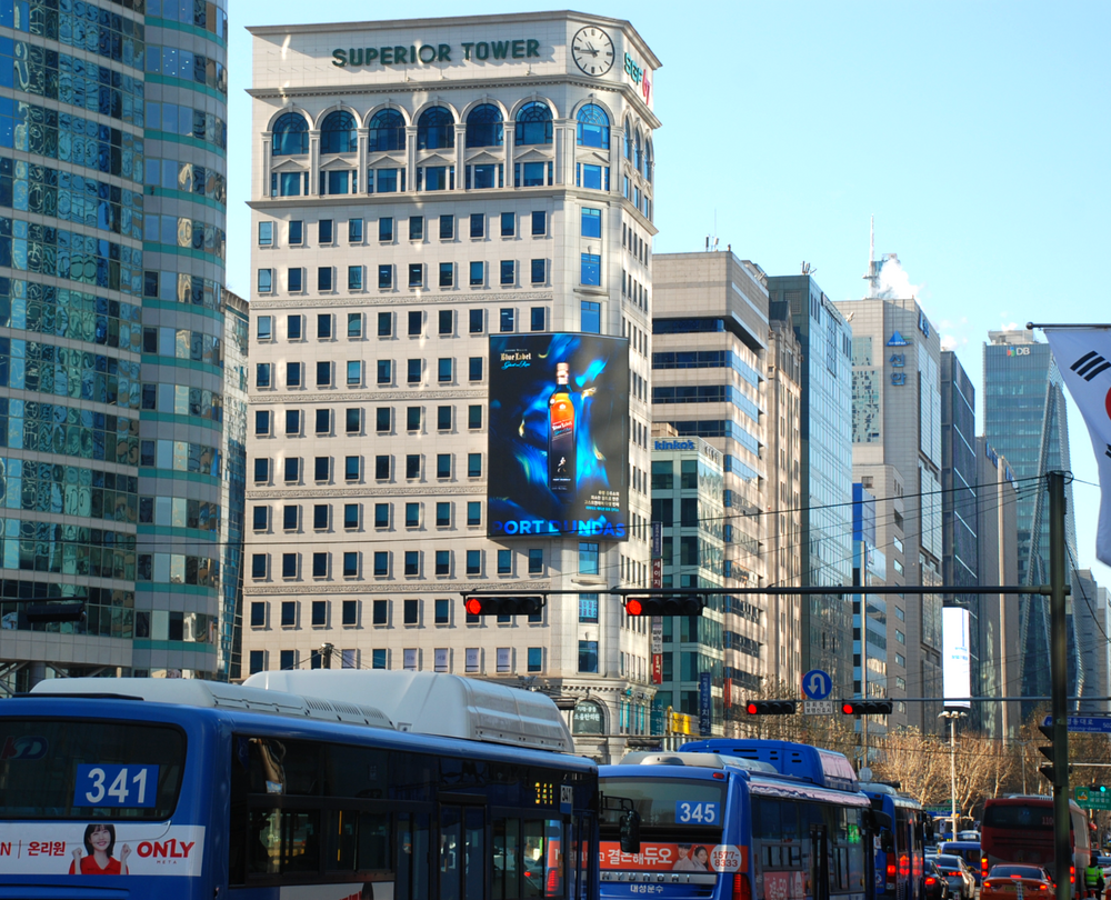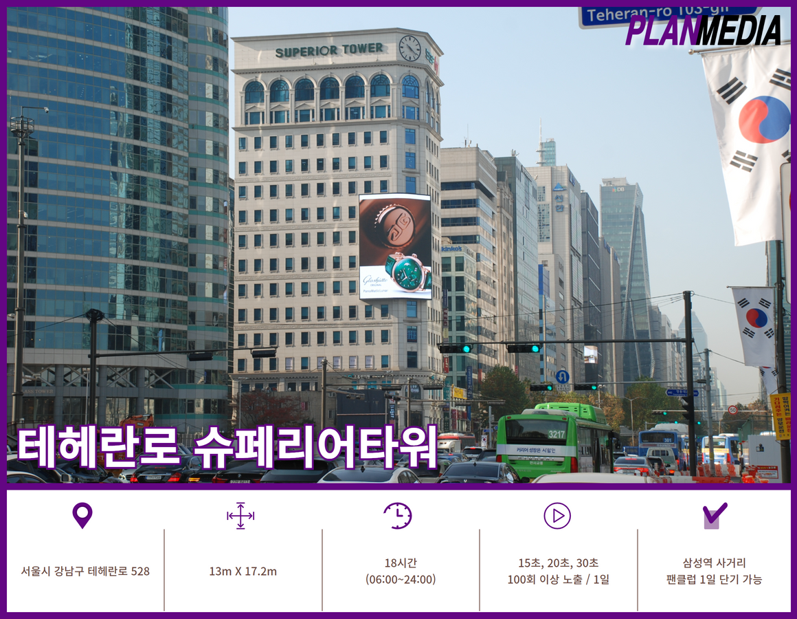 슈페리어타워 전광판은 테헤란로와 영동대로를 모두 커버해 노출되며 가시거리가 뛰어납니다. 봉은사역과 종합운동장역에서 삼성역 사거리로 이동하는 차량들에 모두 효과적으로 광고를 노출합니다. 전광판은 건물 중상단부에 설치되어있으며 건물을 감싸고 있어 다양한 각도에서 영상이 노출됩니다. 팬덤광고로도 유명한 곳이며 단기 광고가 가능합니다.