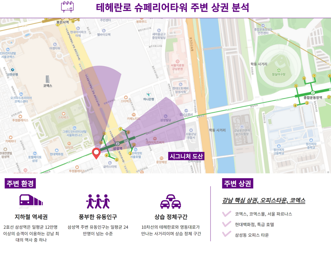 주변으로는 코엑스, 현대백화점, 그랜드인터컨티넨탈 서울파르나스 및 다양한 기업들이 즐비해 출퇴근하는 직장인들과 소비를 위해 방문하는 유동객까지 풍부한 유동인구를 확보하고 있습니다.