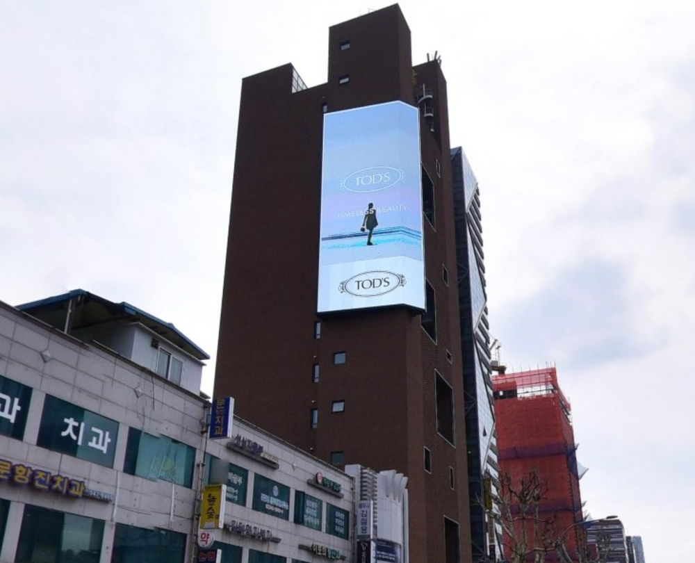 세로 길이 19.6M의 크기를 자랑하는 대형 전광판이며 신사역 인근에서부터 전광판이 확인될 정도로 가시거리가 뛰어납니다.